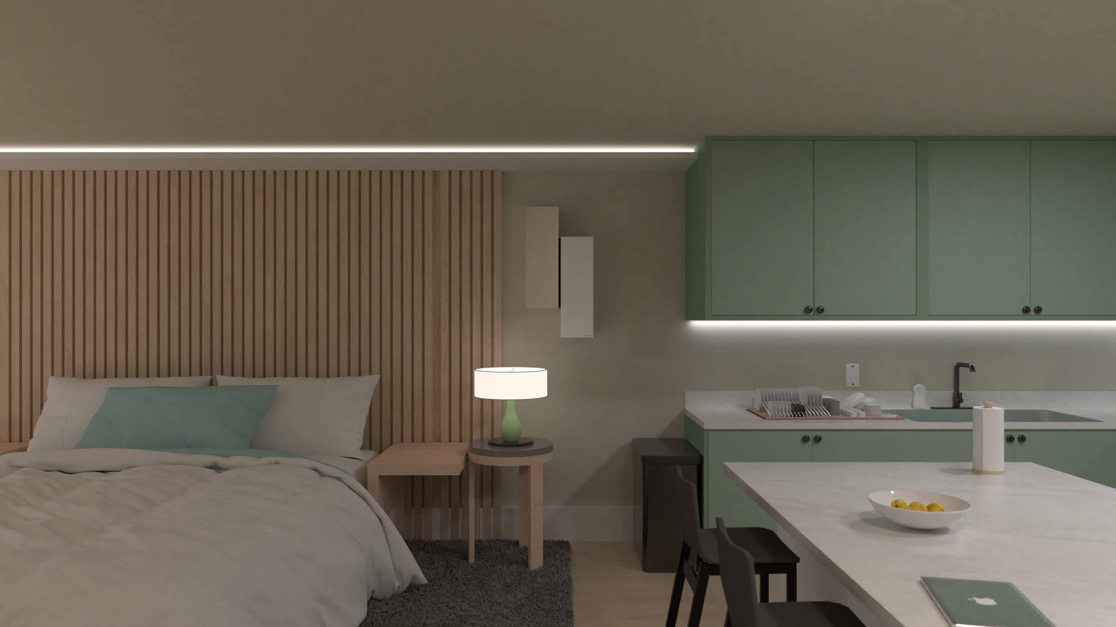 Early on, one of our main goals was to market to the hospitality industry which called for a studio apartment design direction. I ended up modeling several room designs as well as a fabrication of the Cloud S apartment design by Cloud Apartments.
